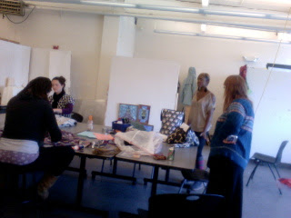 During our team meeting on Friday morning, we worked on our quilts, reviewed our quilts collectively, figured out the order of where the pieces would go, and then generally screwed around and hammed it up. Here are some of the photos taken yesterday by our professors: